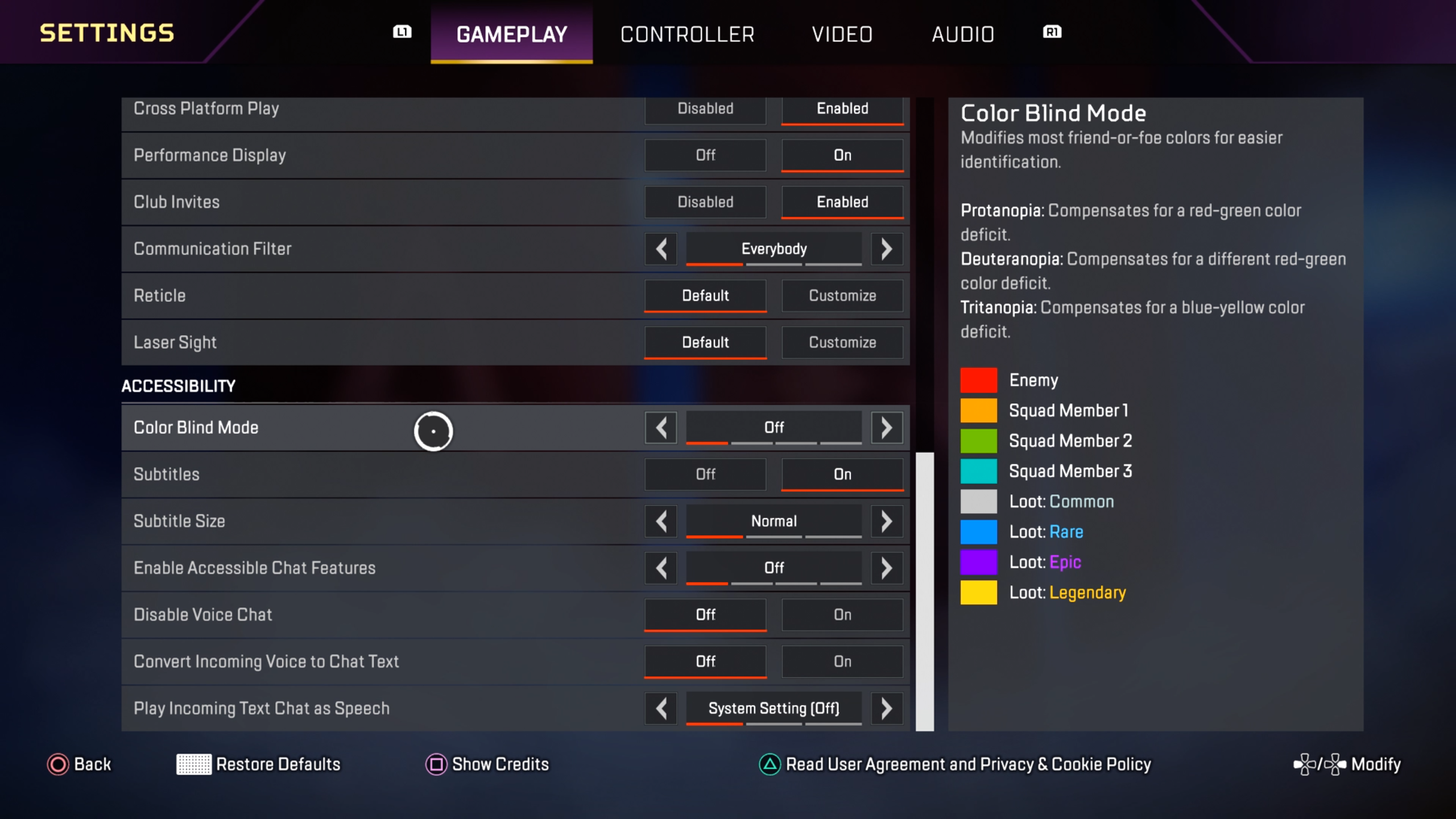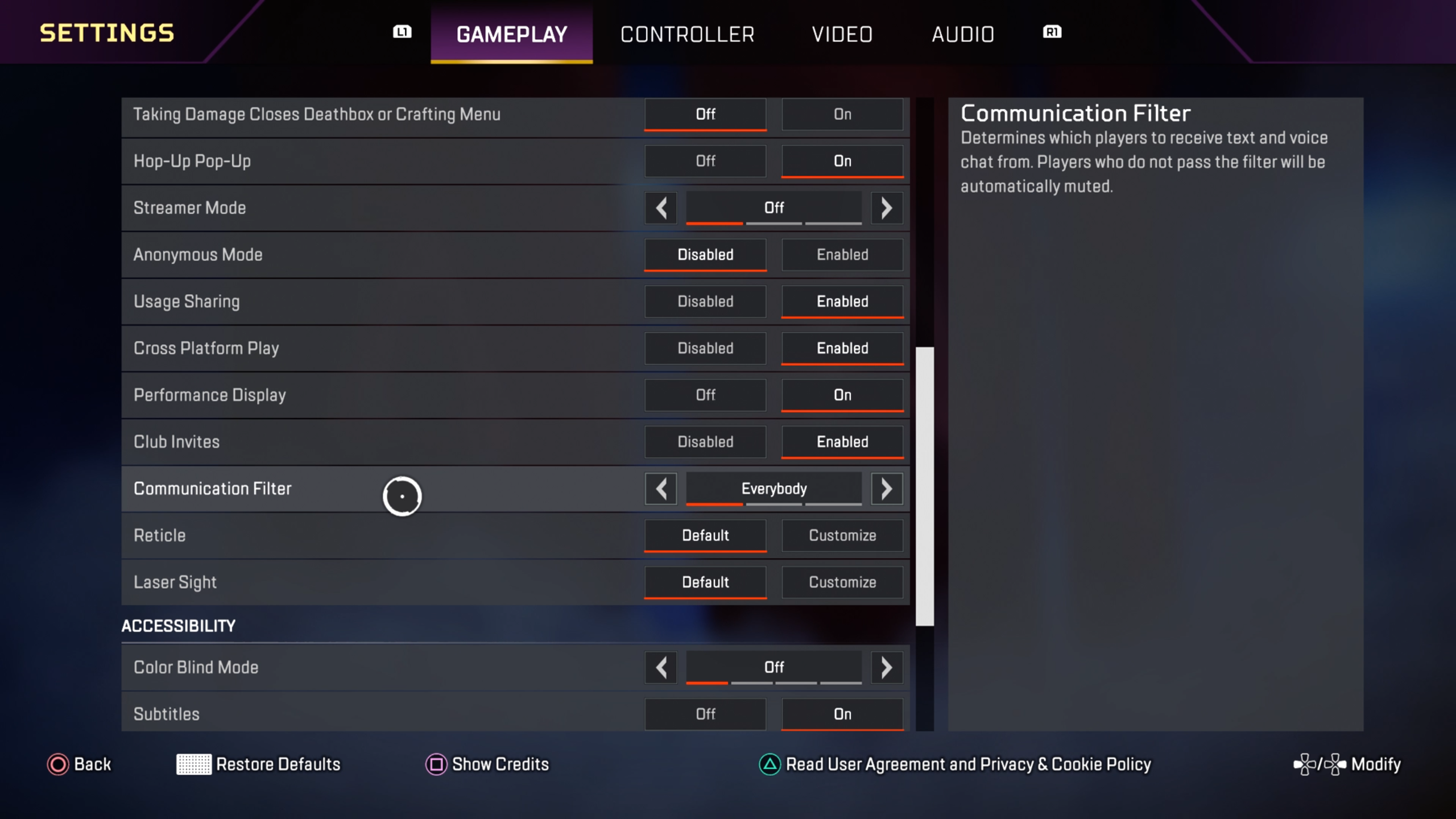 Met de "Communication Filter" is er ook de mogelijkheid om de communicatie via de voice- en tekstchat in-game te filteren. Als de communication filter op “Everybody” staat, kan iedereen in jouw team jou horen en berichten sturen, en jij hen. Met “Friends Only” kun je alleen je vrienden op PSN of in Apex Legends horen en berichten sturen, en zij jou. Met “Nobody” kan niemand jou horen of berichten sturen, en kun jij ook niemand horen of berichten sturen.