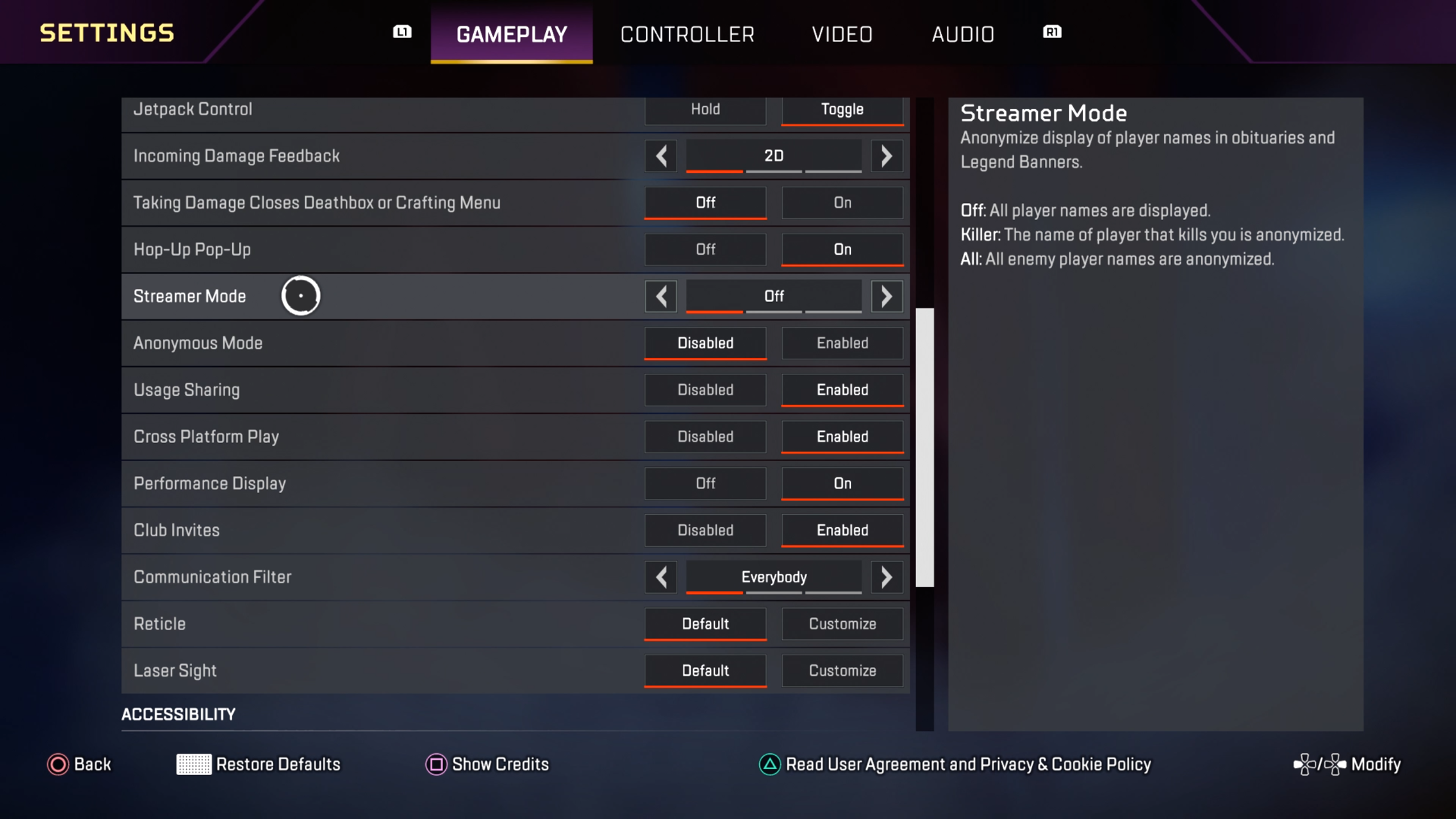 Met de "Streamer Mode" kun je ervoor zorgen dat je de gamertags of usernames van andere spelers niet ziet. Wanneer je de Streamer Mode op “off” zet, kun je iedereens gamertag zien. Wanneer je het op ‘killer” zet, dan kun je de gamertag van degene die jou in-game heeft uitgeschakeld niet zien. Wanneer je het op “all” zet, zijn alle namen anoniem, dus ook de namen in de lijst met acties die spelers uitvoeren rechtsboven in het scherm.