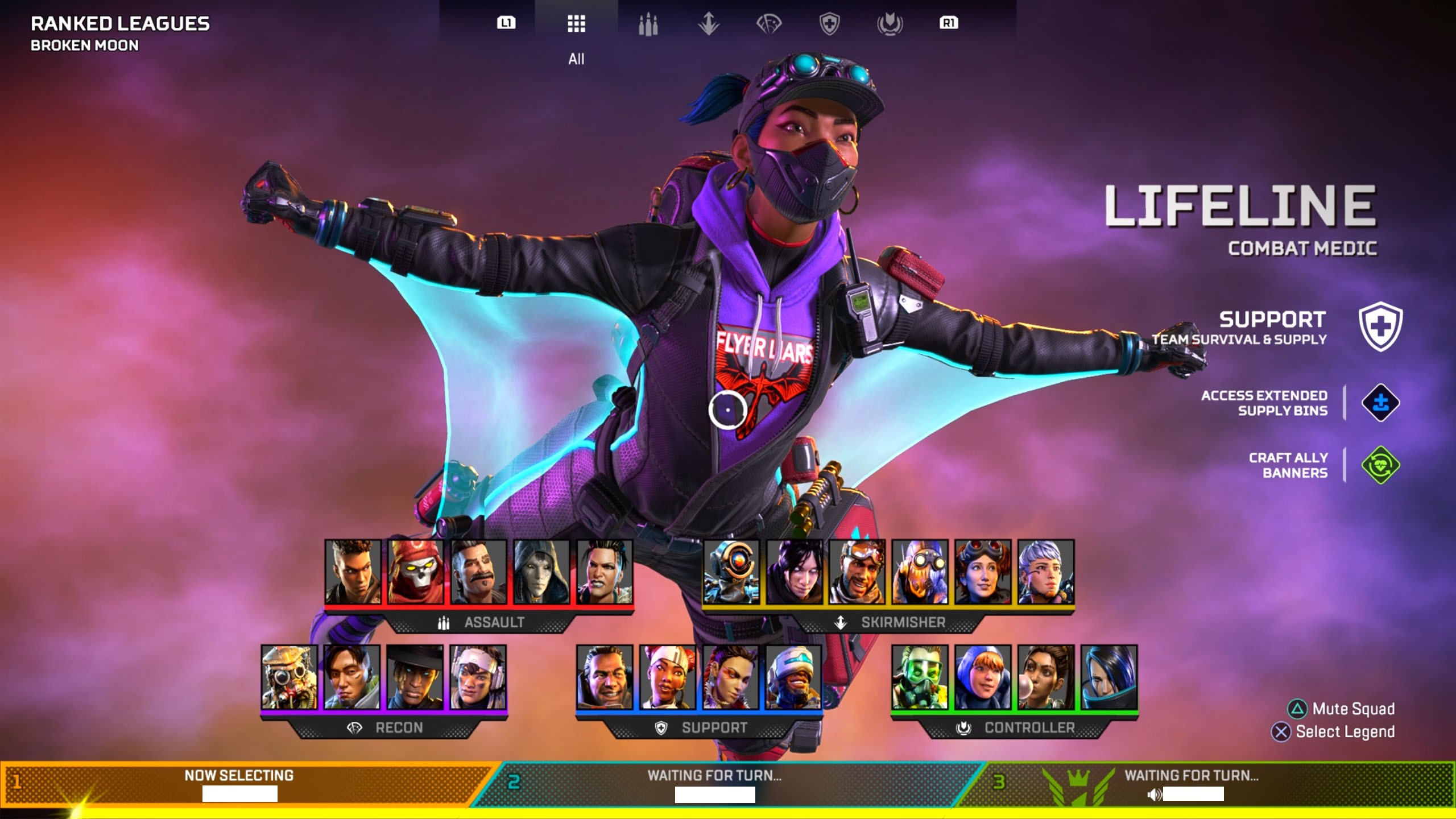 Als een speler kwetsend of ander vervelend gedrag vertoont via de voicechat, kun je ervoor kiezen om ze te muten. Dit houdt in dat je hun voicechat uitschakelt voor jezelf zodat je ze niet meer hoort. Dit kun je al doen voordat je match is begonnen in de “character select” waarin het team zijn karakter moet selecteren. Dit scherm zie je hieronder. De enige optie hier is om de hele squad te muten.