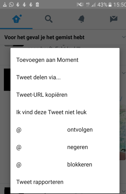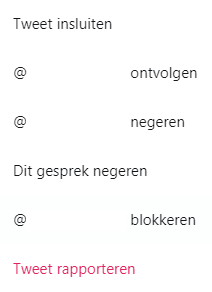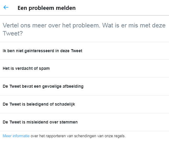 - Klik op het pijltje naast het bericht en druk vervolgens op de knop “Tweet rapporteren”. Op de computer ziet dat er zo uit: