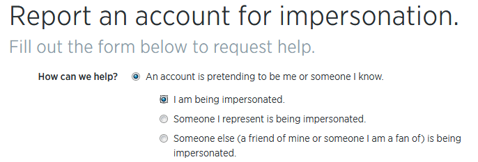 - Kies voor de optie “An account is pretending to be me or someone I know” en kies voor de onderstaande opties: